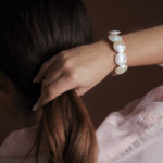 צמיד פנינים בעיצוב אלגנטי ונשי, עשוי מצדפה טבעית עגולה ופניני מים מתוקים המשדרים רוך, טוהר ונוכחות שקטה.