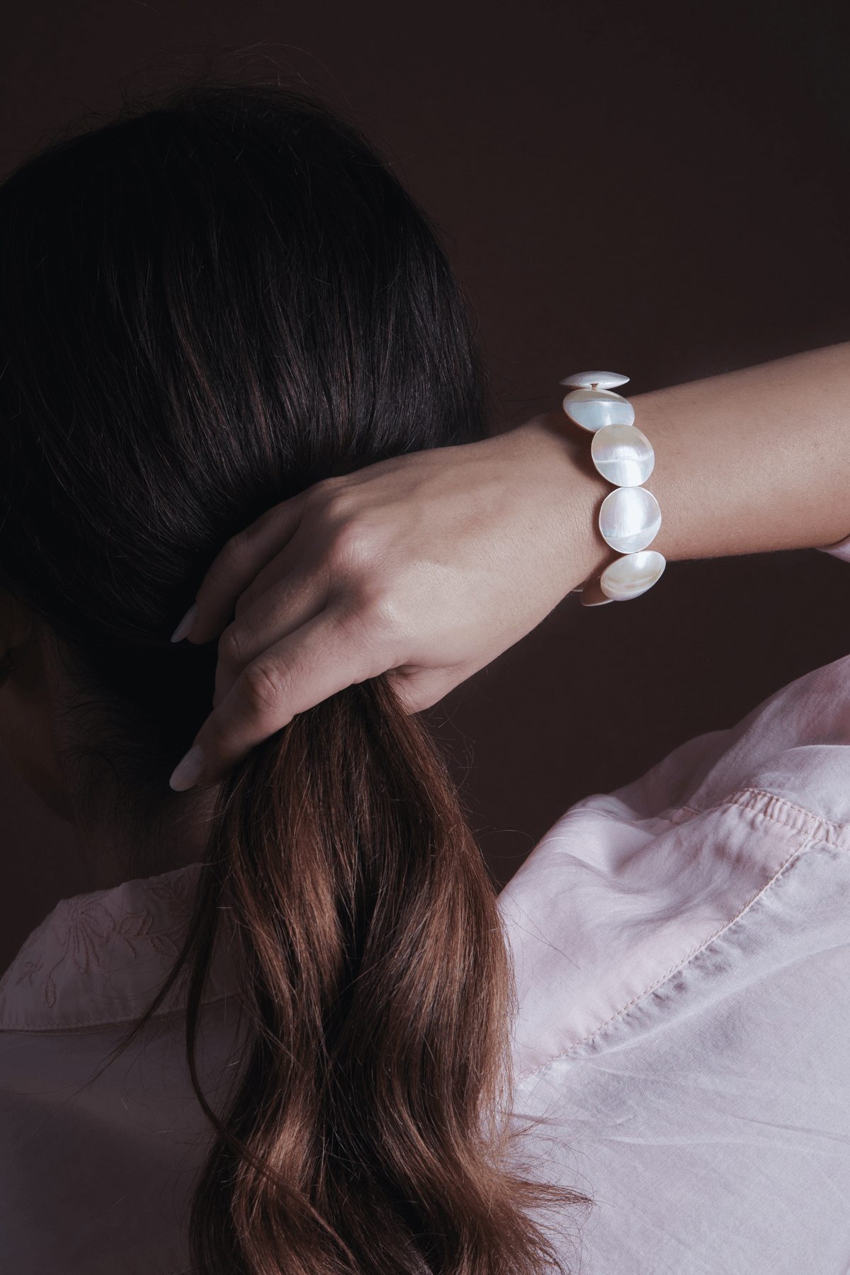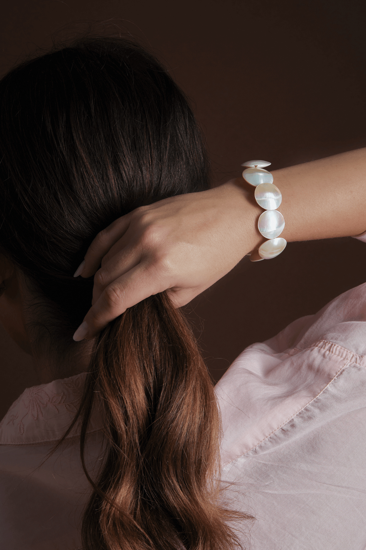 צמיד פנינים בעיצוב אלגנטי ונשי, עשוי מצדפה טבעית עגולה ופניני מים מתוקים המשדרים רוך, טוהר ונוכחות שקטה.