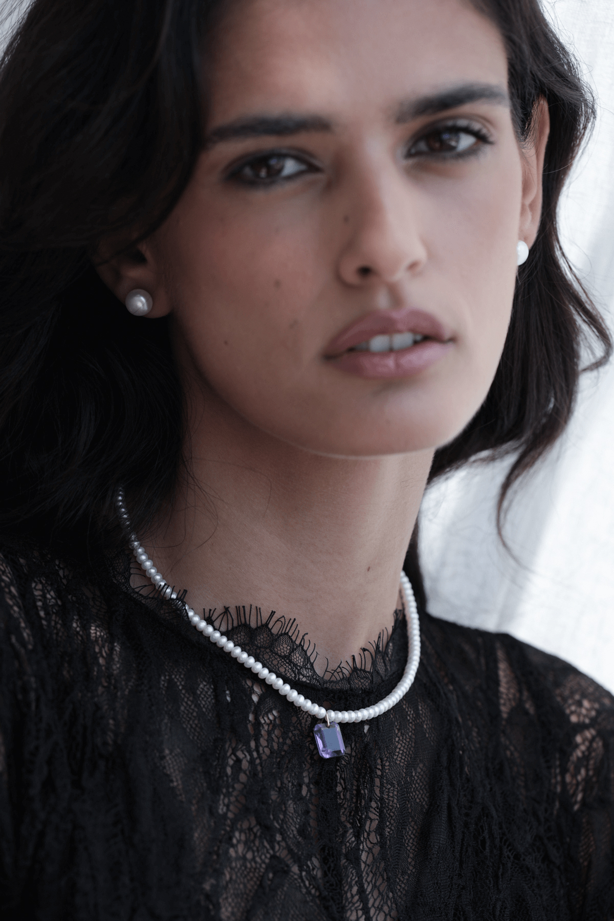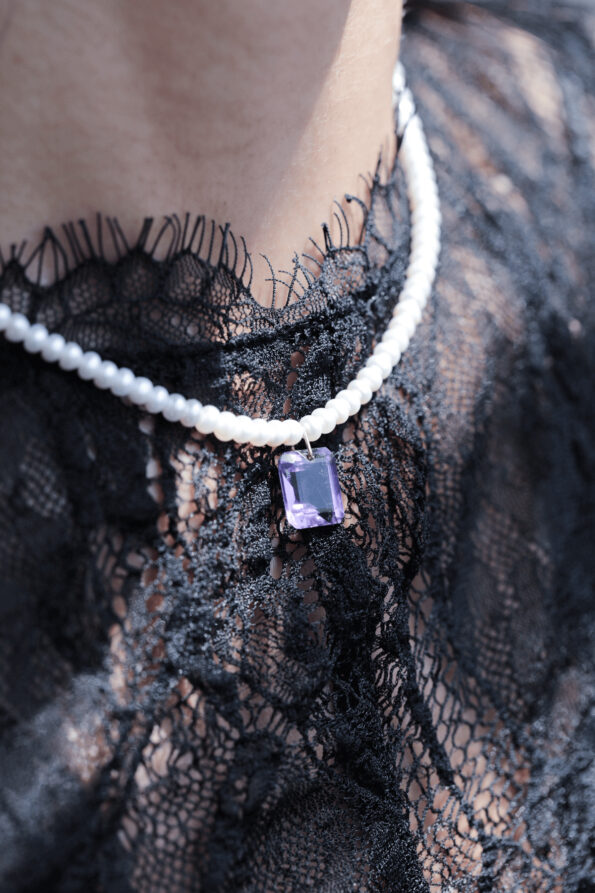 שרשרת פנינים קלאסית עם תליון אבן אמטיסט מלוטשת בגוון סגלגל עמוק. שילוב מושלם בין עדינות הפנינים לנוכחות הצבעונית של האבן.