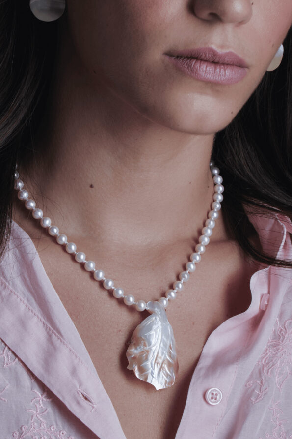 שרשרת פנינים בעיצוב נקי ואלגנטי עם תליון צדפה טבעית בצורת עלה – שילוב הרמוני של קלאסיקה עם נגיעה מהים והטבע.