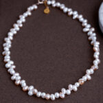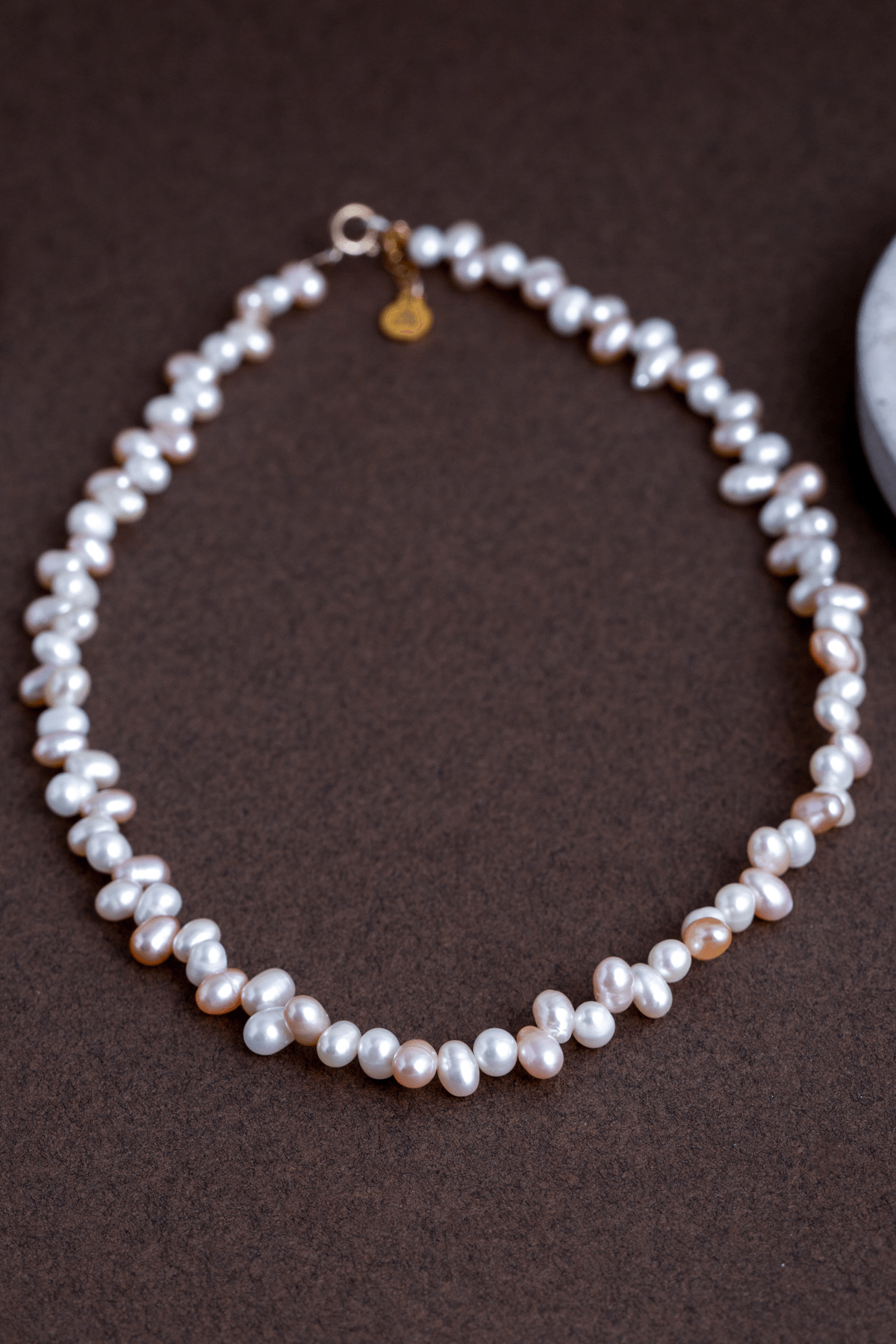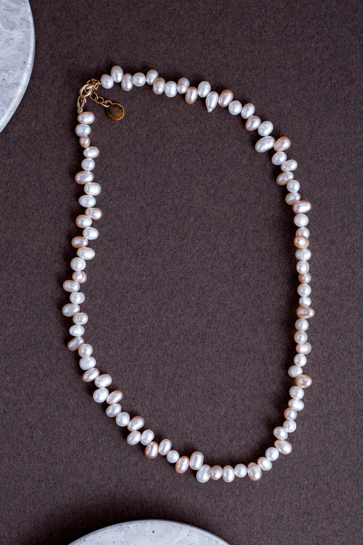 שרשרת פנינים עשויה פניני מים מתוקים בגוונים טבעיים של שמנת, אפרסק ולבן, בעיצוב לא סימטרי המעניק מראה רך, חמים ונשי.