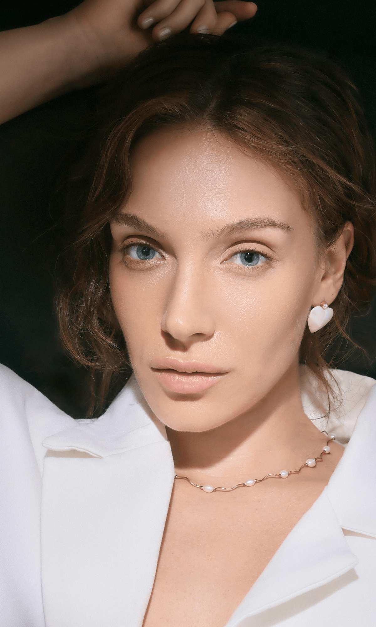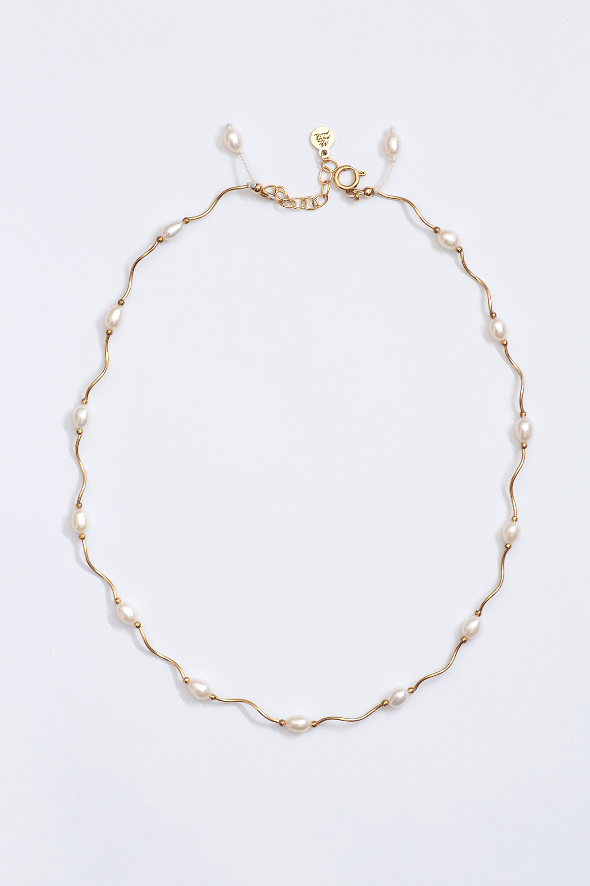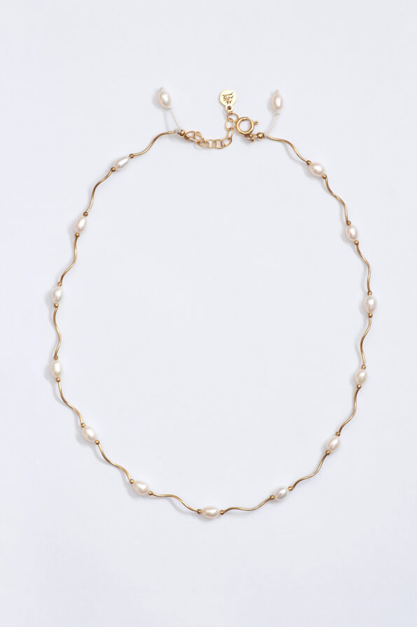 תכשיט בעיצוב אמנותי מודרני, משלב פניני מים מתוקים עם אלמנטים מתכתיים גליים, ליצירת תחושת זרימה והרמוניה טבעית.