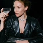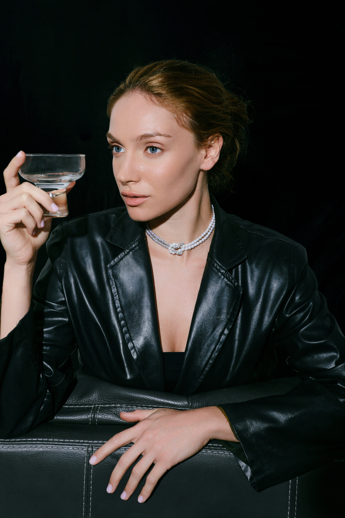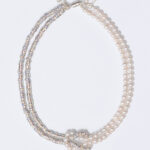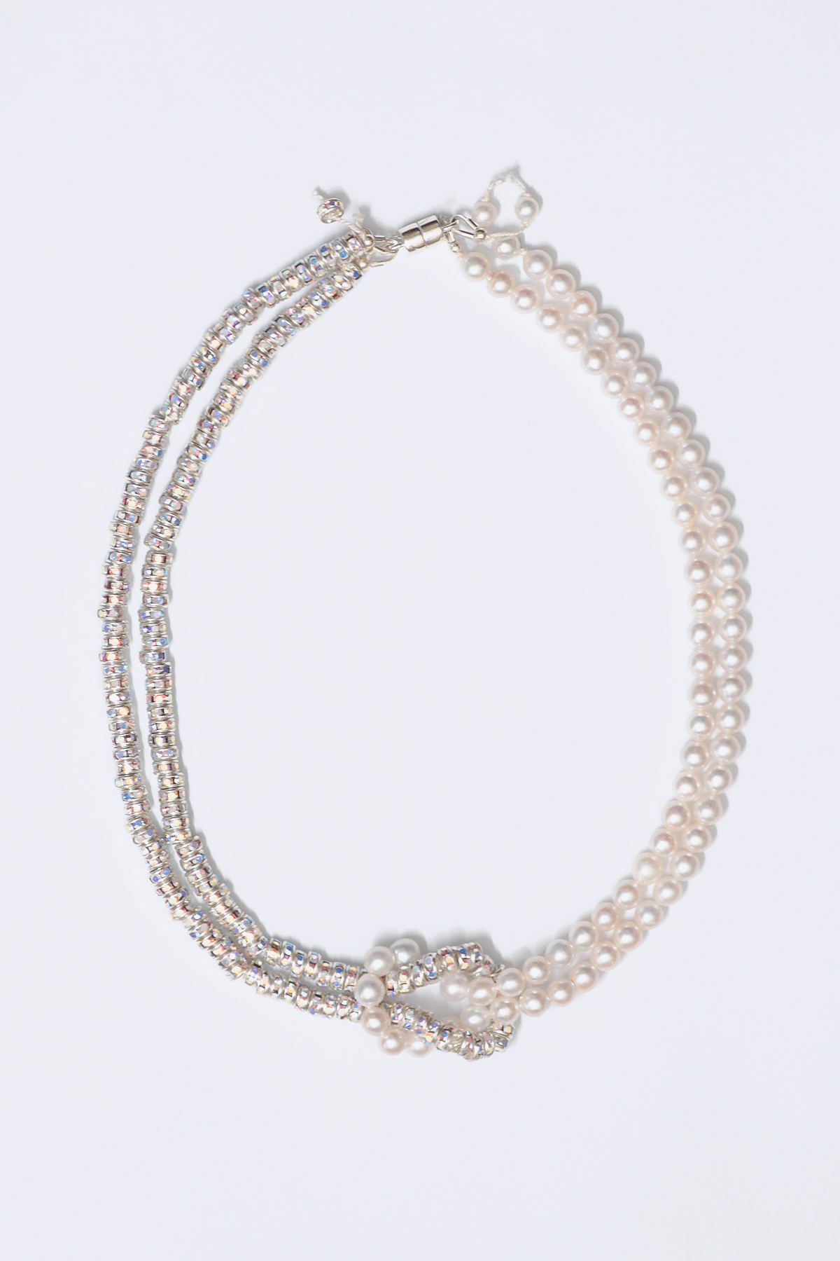 שרשרת דו צדדית בעיצוב איקוני חצי משובץ בקריסטלים נוצצים וחצי מפניני ים טבעיות, נשזרות יחד בקשר ייחודי שמסמל חיבור בין עוצמה לרוך, בין גלאם לנשיות אלגנטית.
